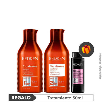 Pack incluye: 1 Shampoo Frizz Dismiss 300ml + 1 Acondicionador Frizz Dismiss 300ml + REGALO Tratamiento activador de brillo Acidic Color Gloss 50ml. Los productos incluidos en el pack no son intercambiables. Imágenes referenciales.