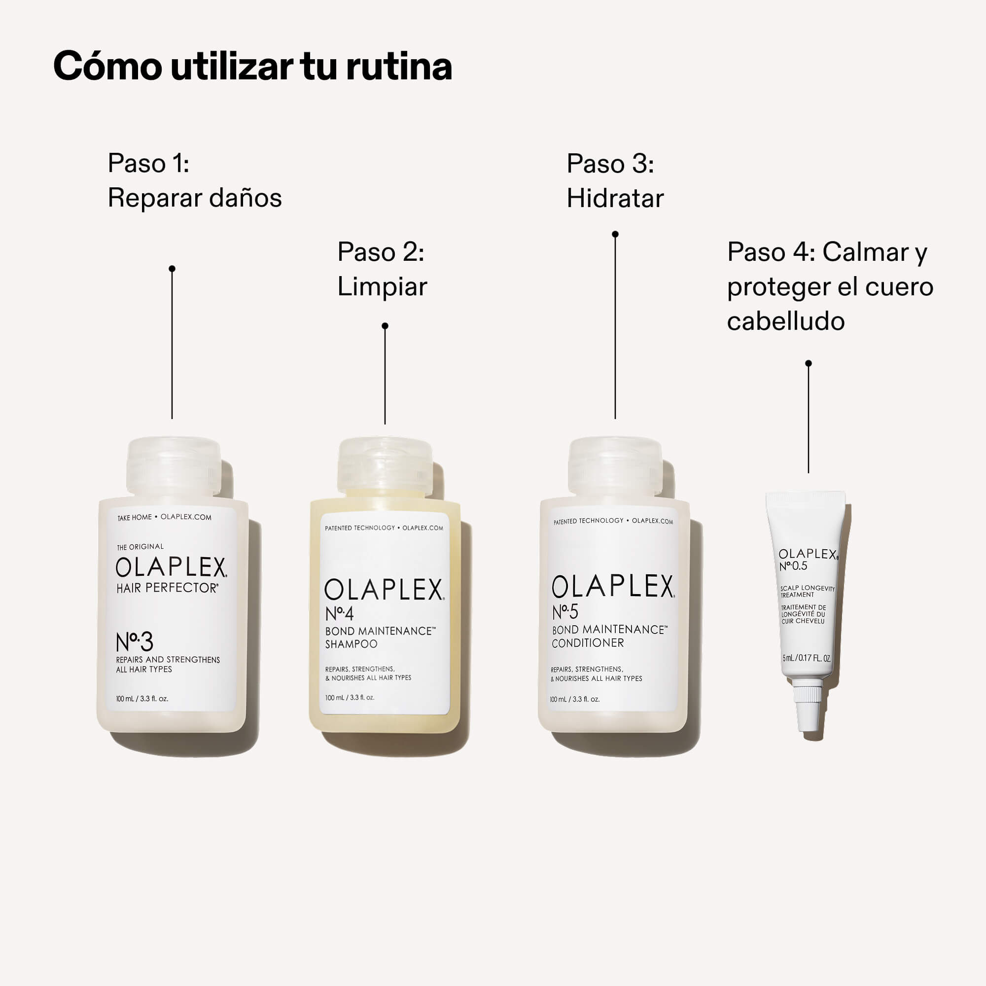 OLAPLEX N°.0.5 SCALP LONGEVITY TREATMENT: Es un suero ligero para el cuero cabelludo que hidrata y calma al instante, a la vez que lo protege contra el envejecimiento acelerado para promover la salud capilar a lo largo del tiempo. Para todo tipo de cabellos y cuero cabelludo. Aprobado por tricólogos y probado por dermatólogos.