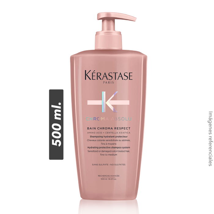 Shampoo Bain Chroma Respect protector del color con aminoácidos para todo tipo de cabello teñido de fino a medio. No contiene sulfatos, parabenos ni siliconas de la marca profesional francesa Kérastase.