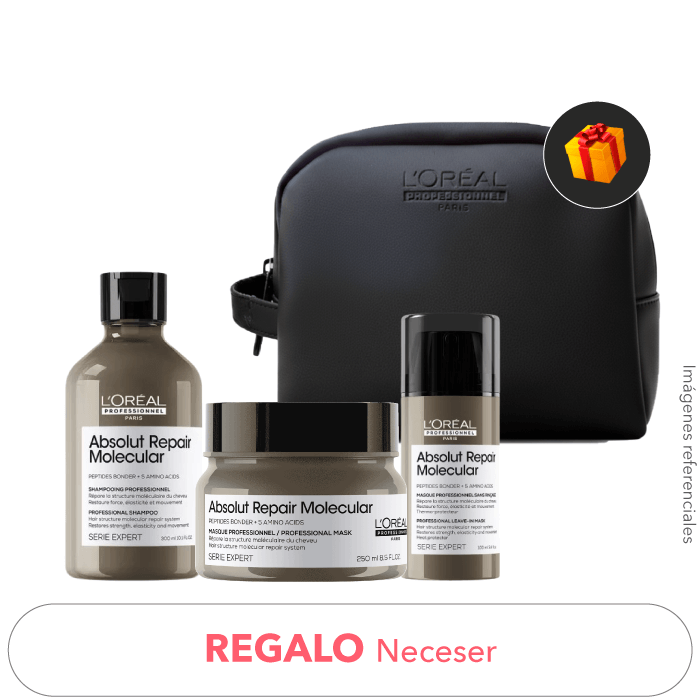 Pack incluye: Shampoo Absolut Repair Molecular 300ml + Mascarilla Absolut Repair Molecular 250ml + Protector Térmico en crema Absolut Repair Molecular + REGALO Bolso. Los productos incluidos en el pack no son intercambiables. Imágenes referenciales.