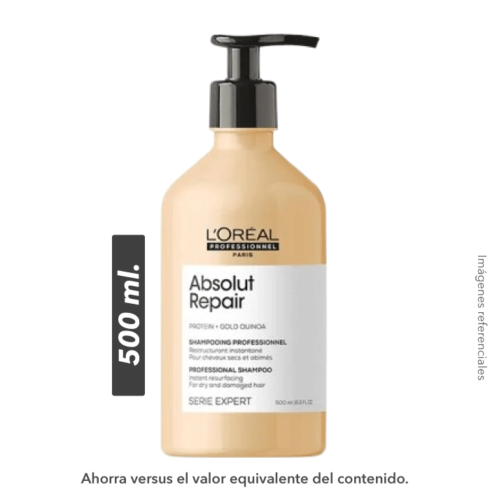 El shampoo Absolut Repair de la marca Loreal Professionnel ofrece la mejor experiencia de reparación profesional para el cabello dañado y sobre-procesado. Los resultados están probados: el shampoo repara visiblemente el cabello dañado con un toque muy ligero y suave, lo que resulta en un 77%* menos de daño en la superficie de la fibra. El cabello es fácil de manejar y 7X** más brillante después de la rutina de tratamiento, incluida la mascarilla reparadora Absolut Repair. La fibra se fortalece y restaura gracias a los poderosos ingredientes de superalimentos como la quinoa y la proteína. Esta fórmula profesional es utilizada y aprobada por los peluqueros y forma parte del tratamiento en el salón de los salones L'Oréal Professional Paris de todo el mundo.