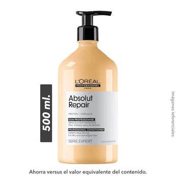 El acondicionador Absolut Repair de Loreal Professionnel ofrece la mejor experiencia de reparación profesional para el cabello dañado y seco. El acondicionador repara visiblemente el cabello dañado con un tacto muy ligero y suave, trata y desenreda sin dañar el cabello. El cabello queda más manejable y brillante después de la rutina de tratamiento que incluye el shampoo reparador Absolut Repair. La fibra se fortalece y restaura gracias a los poderosos ingredientes como el omega y la proteína. Esta fórmula profesional es utilizada y aprobada por los peluqueros y forma parte de su tratamiento en el salón de los salones L'Oréal Professional Paris de todo el mundo.