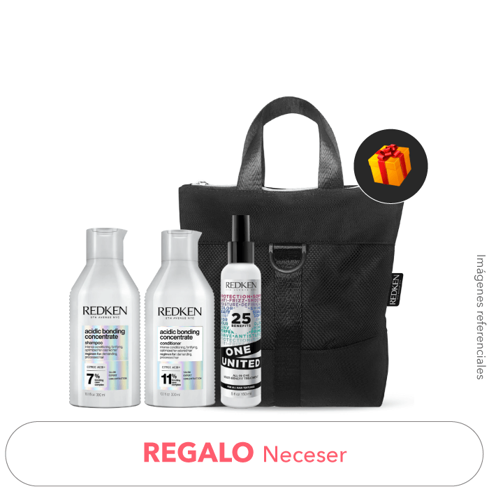 Pack incluye: Shampoo Acidic Bonding Concentrate 300ml + Acondicionador Acidic Bonding Concentrate 300ml + Tratamiento en spray One United 150ml + REGALO Neceser. Los productos incluidos en el pack no son intercambiables. Imágenes referenciales.