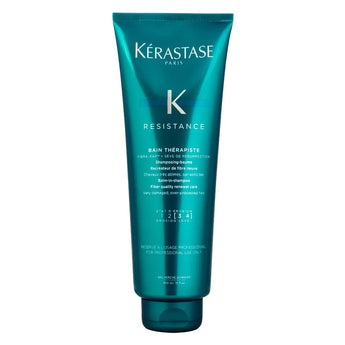 El shampoo Resistance Bain Thérapiste es de la marca profesional francesa Kerastase. Es diseñado para cabellos muy dañados y demasiado procesados. Recubre la fibra durante el lavado para brindar brillo y suavidad.