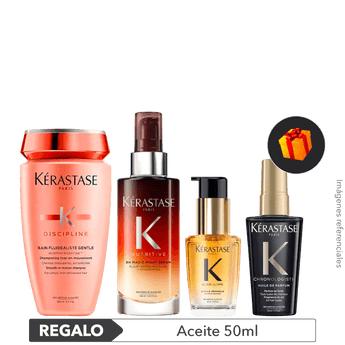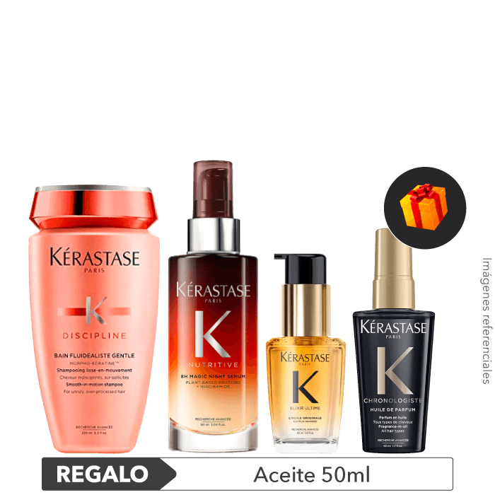 Pack incluye: Shampoo Discipline sin sulfato 250ml + Serum 8H Nutritive 90ml + Aceite Huile Elixir Originale 30ml + REGALO Mascarilla 75ml. Los productos incluidos en el pack no son intercambiables. Imágenes referenciales.