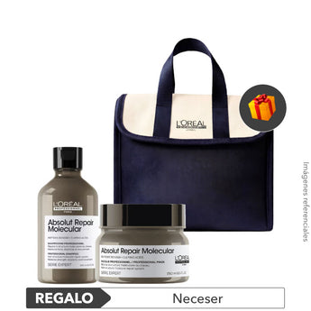 Pack incluye: Shampoo Absolut Repair Molecular 300ml + Mascarilla Absolut Repair Molecular 250ml + REGALO Neceser. Los productos incluidos en el pack no son intercambiables. Imágenes referenciales.